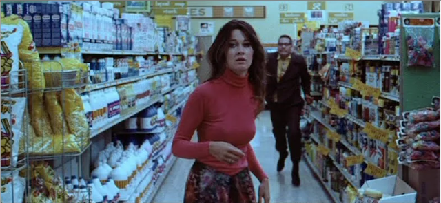 Ultimately, the film plays like a hybrid of a zombie and a cannibal flick, with some genuinely creepy scenes set in a seemingly-deserted supermarket and, in the film's most memorable set-piece, a movie theater, which must have played like gangbusters at the time in one. The film, like most 70's horror, does move at a slower pace than those zombies, but the general atmosphere of dread and foreboding is so strong and unrelenting that you might not mind in this case.